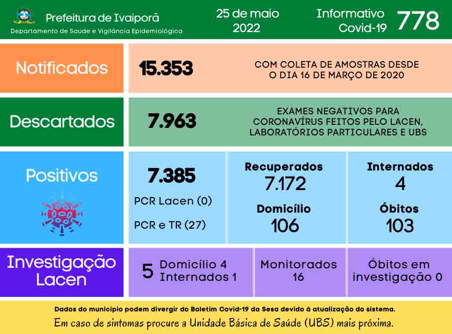 Com mais esses diagnósticos Ivaiporã soma agora 7.385 pessoas infectadas com o coronavírus desde o início da pandemia, 7.172 curadas e 103 óbitos.