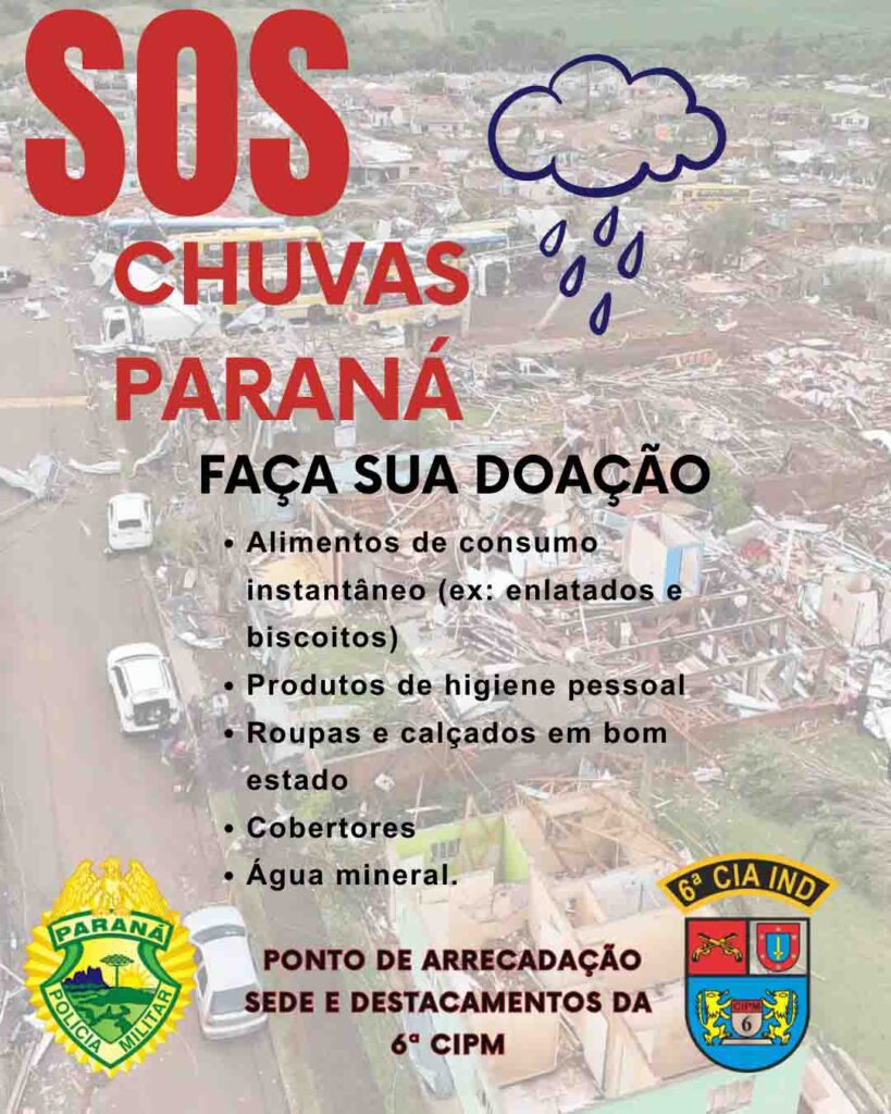 A 6ª Companhia Independente da Polícia Militar (6ª CIPM) de Ivaiporã iniciou uma campanha emergencial de arrecadação de doações destinada às famílias atingidas pelo tornado que destruiu grande parte das residências em Rio Bonito do Iguaçu (PR) na sexta (7).