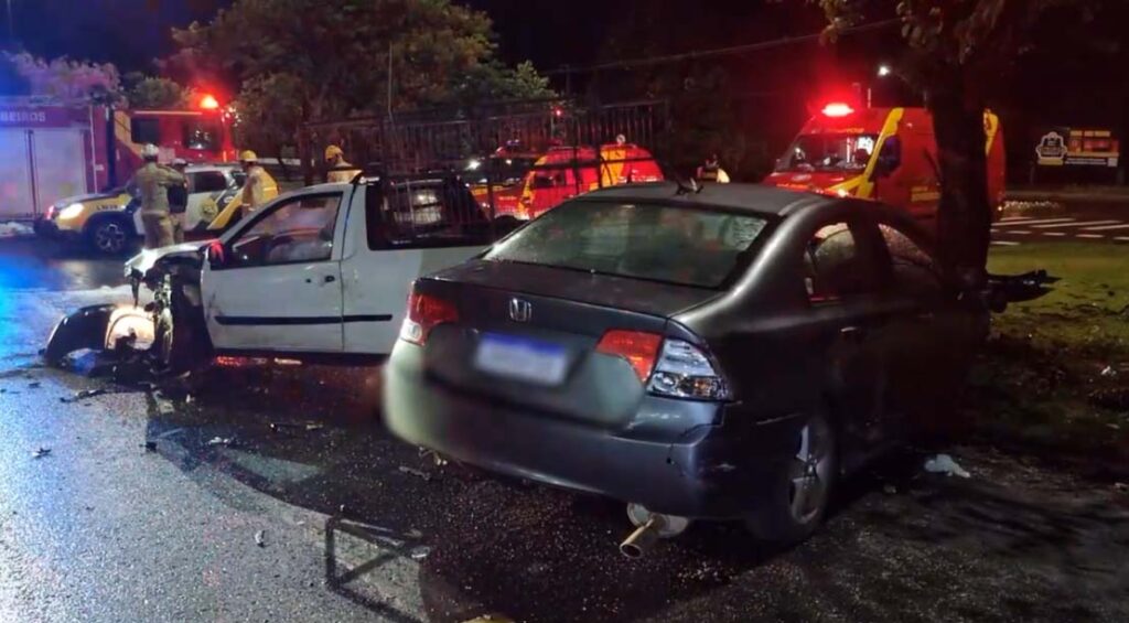 Uma colisão entre dois automóveis deixou cinco pessoas feridas na madrugada desta terça-feira (16), no cruzamento da Rua Mylla com a Avenida Tancredo Neves, entre os bairros Pioneiros Catarinense e Santa Cruz, na região oeste de Cascavel.