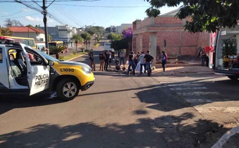 O acidente ocorreu às 15h25, no centro da cidade, no cruzamento da Av. Curitiba com a Rua Meron Heuko e envolveu VW/Crosfox e uma motocicleta, Honda/Biz