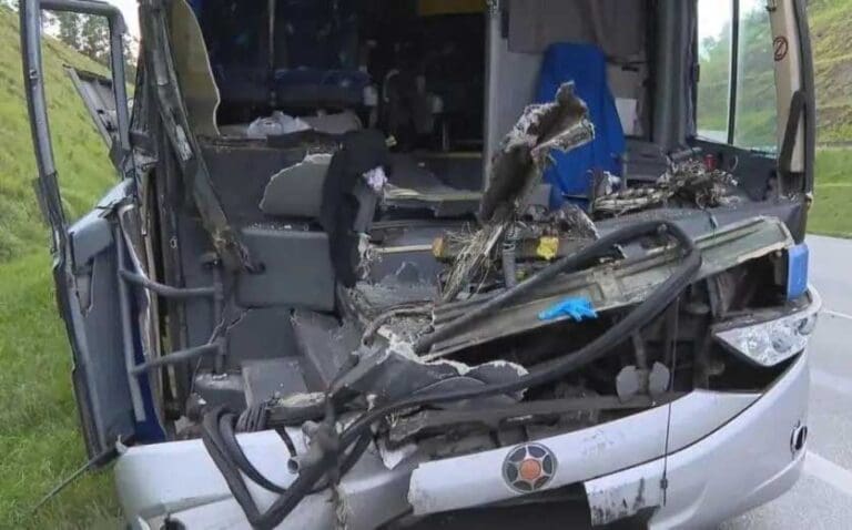 Parte dianteira do ônibus ficou completamento destruída / Foto: Reprodução