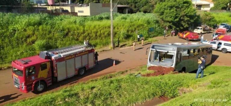 Os bombeiros informaram que o condutor do transporte coletivo atingiu a moto, perdeu o controle da direção e avançou contra um barranco.
