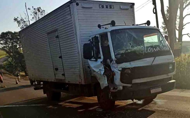 O acidente envolveu um caminhão Chevrolet azul com placas de Godoy Moreira e um caminhão baú VW 160 branco com placas de Maringá.