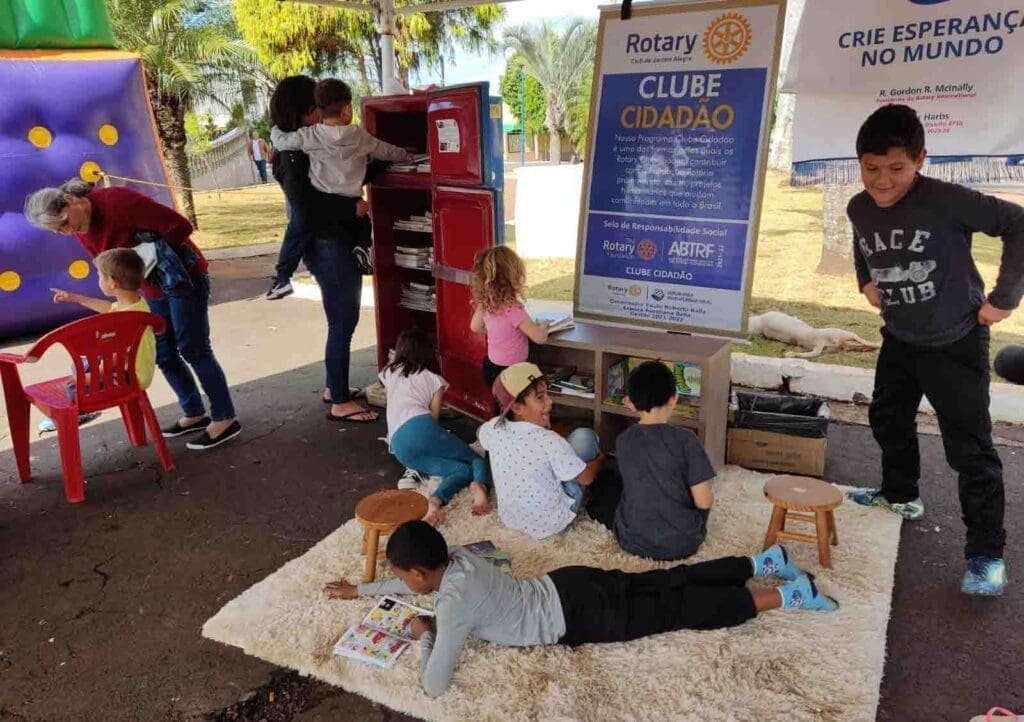 Os rotarianos participaram do evento com espaço de incentivo à leitura para as crianças, orientações de combate à dengue, e na coleta de livros para as geladeiras culturais instaladas pelo próprio clube no lago municipal e na praça em frente ao Colégio Cristóvão Colombo.