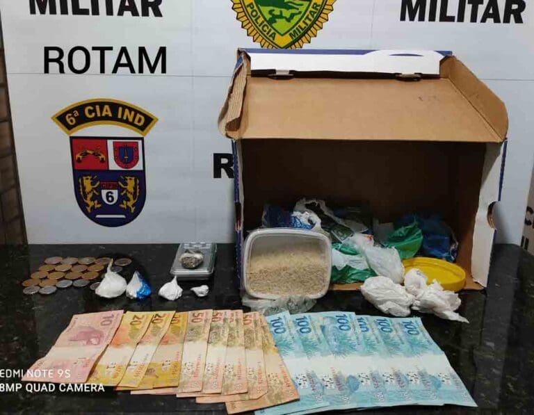 Diante do flagrante foi realizado buscas na residência e encontrado mais algumas porções de cocaína que pesaram 16,0 gramas, uma porção de maconha com peso de 3,6 gramas, uma balança de precisão, materiais para acondicionamento de drogas e ainda R$10,75 reais em moedas.
