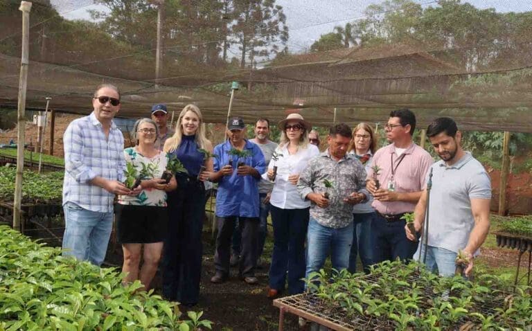 As mudas foram entregues no Viveiro de Café, onde estiveram o prefeito Carlos Gil, que também é produtor rural, diretores dos Departamentos de Agricultura, Agronegócio e de Viação, Estela Bagio Zanetti, Alex Fonseca e Ilson Gagliano – respectivamente, presidente da Câmara de Vereadores, Gertrudes Bernardy, e chefe do Núcleo Regional da Seab de Ivaiporã, Vitória Holzmann.