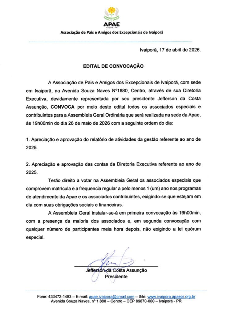 A Apae de Ivaiporã convocou associados para Assembleia Geral Ordinária no dia 26 de maio de 2026, às 19 horas, na sede da entidade, na Avenida Souza Naves, no Centro.