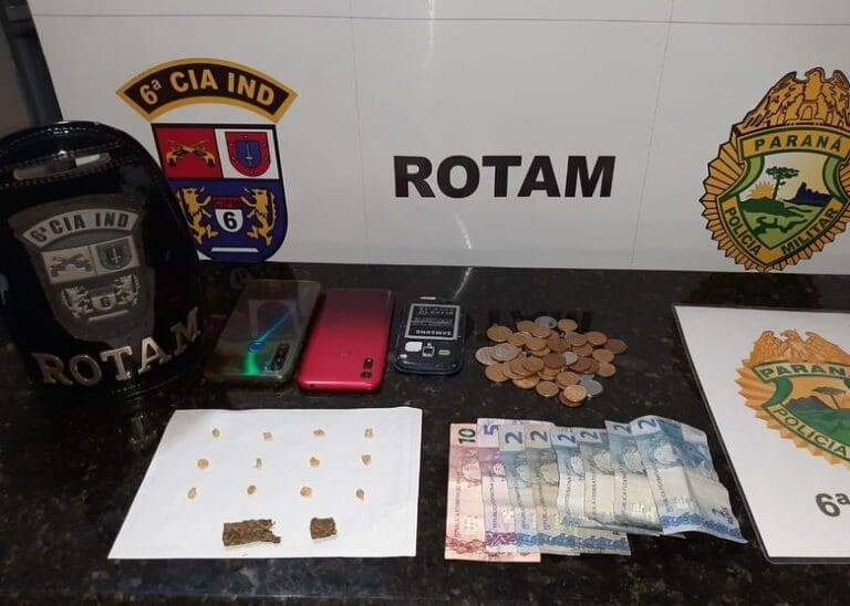 Em buscas pela residência foi encontrado um celular Xiaomi Redmi Note 8 azul, uma furadeira Bosch, os quais não souberam informar a origem. Foi encontrado ainda o celular da mulher suspeita de tráfico, 1,60 grama de maconha e R$ 34,70 reais em cédulas e moedas.