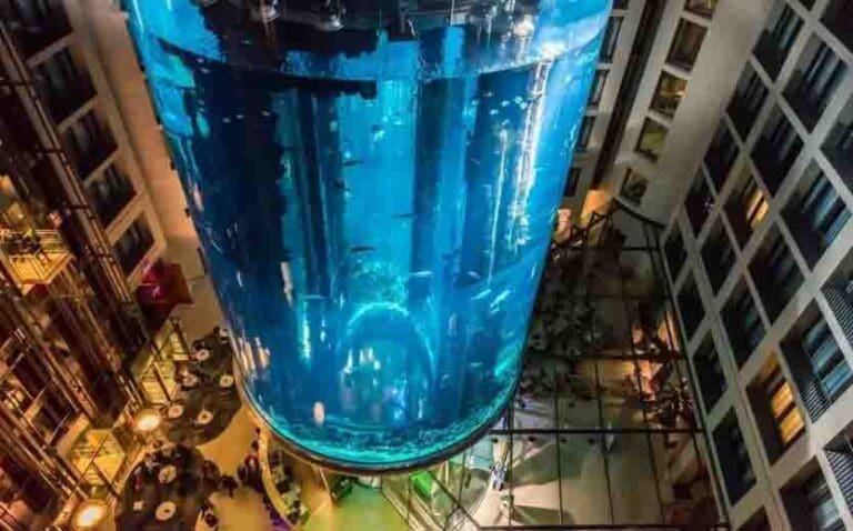 O aquário gigante abrigava um elevador panorâmico e ficava dentro de um complexo hoteleiro no bairro de Mitte, um dos mais movimentados do centro da capital alemã. Dentro do espaço, há um hotel, um museu e restaurantes.