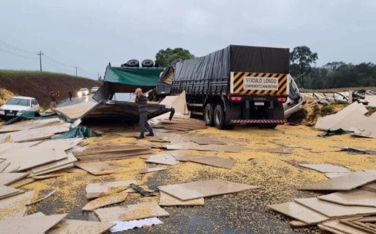 Segundo informações da Polícia Rodoviária Estadual  (PRE), o acidente que ocorreu por volta das 8h30 , entre Pato Branco e Mariópolis, e envolveu um caminhão carregado com milho de São Mateus do Sul/PR e um caminhão que transportava compensados com  placas de Ampére/PR.