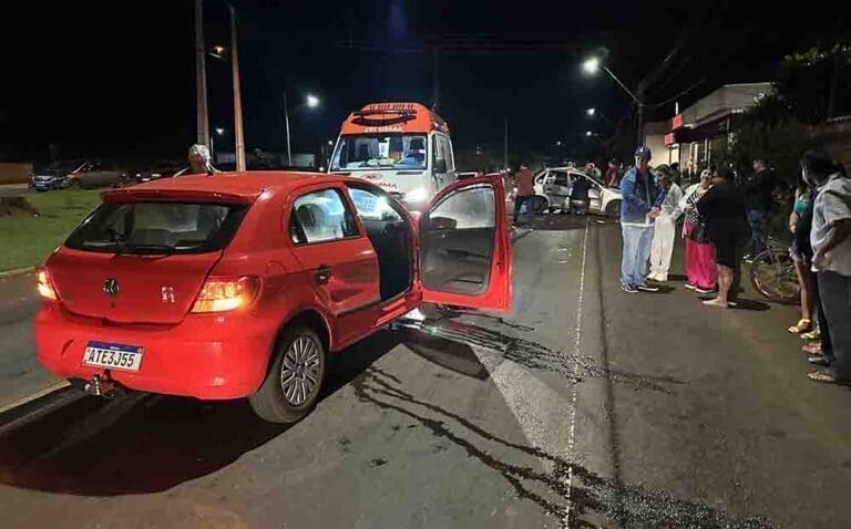 A colisão aconteceu na esquina da Av. Natael Emerenciano Júnior (prolongamento da PR-082) com a Rua Laércio Costa e envolveu um GM Corsa e um VW Gol em frente a Bacana Motors.