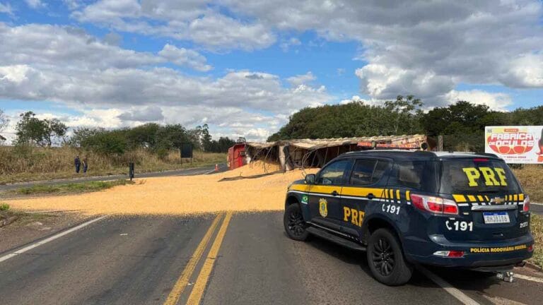 Bitrem carregado de milho tomba no trevo de Loanda, motorista fica ferido