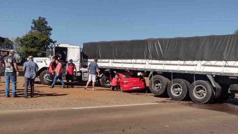 De acordo com informações do Corpo de Bombeiros, o carro ficou prensado no semirreboque da carreta, e duas vítimas ficaram presas nas ferragens.