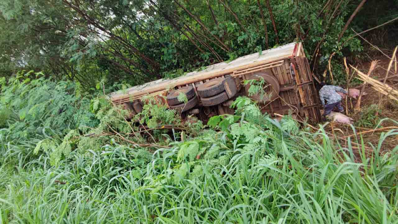 Segundo a Polícia Rodoviária Estadual (PRE), um caminhão carregado de porcos tombou, despencando em uma ribanceira, próximo a Vila Rural II.