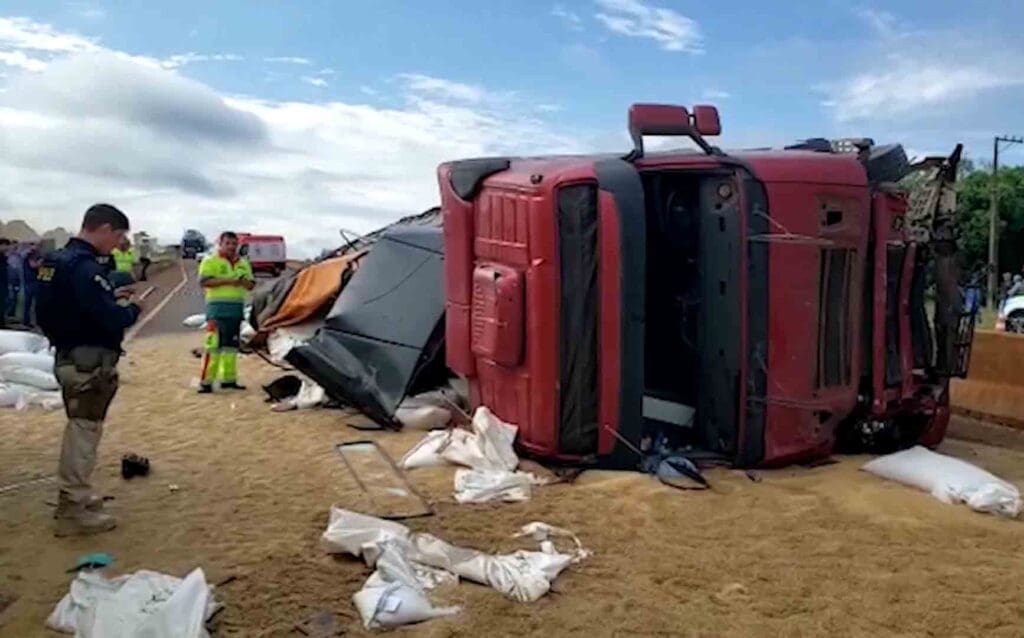 Ao tentar desviar o caminhão bateu na mureta, atingiu a traseira de um caminhão Baú e tombou em cima do Celta. Um terceiro caminhão caçamba, também foi atingido.