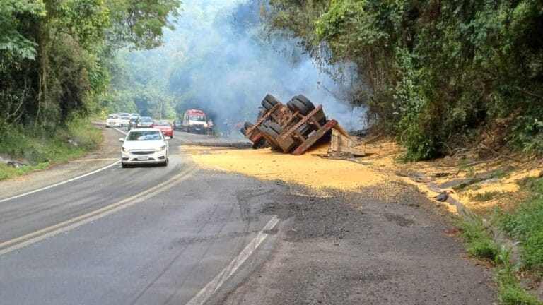 Um caminhão carregado com milho tombou e pegou fogo na tarde de quinta-feira, no km 123 da BR-153, em Ibaiti no Norte Pioneiro do Paraná. O acidente ocorreu por volta das 14h e gerou bloqueio total no sentido Ibaiti-Ventania.