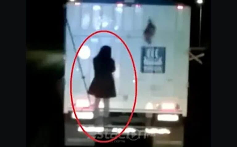Para tentar provar para os mais incrédulos, os caminhoneiros compartilharam um vídeo que mostra o momento em que um dos veículos se aproxima com o farol alto e revela a mulher vestida de casaco preto agarrada na traseira do caminhão.