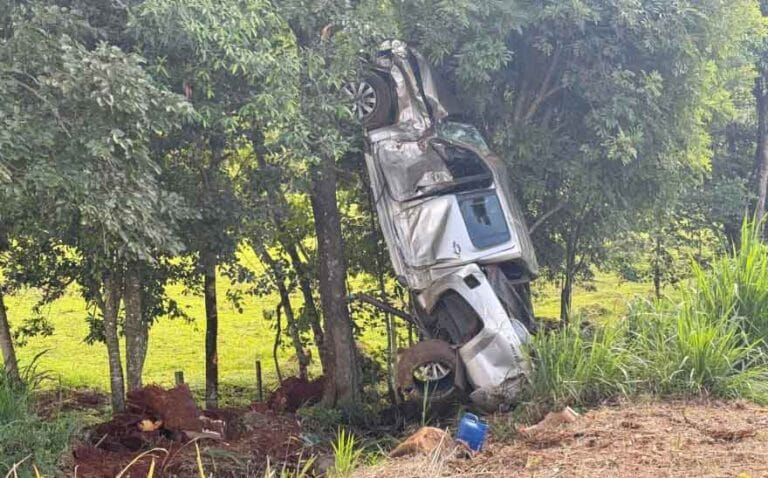 O veículo seguia sentido Itapejara D’Oeste a Francisco Beltrão, quando o motorista perdeu o controle da caminhonete, saiu da pista e colidiu contra um barranco antes de ficar suspenso na árvore.