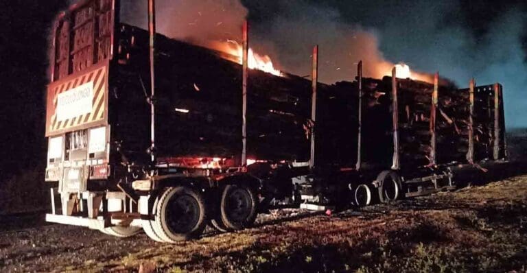 Uma carreta carregada com toras de madeira de eucalipto pegou fogo na noite de domingo (4) na Pr-272, próximo a empresa Agrinova, em Faxinal.