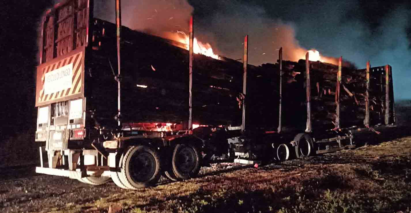 Uma carreta carregada com toras de madeira de eucalipto pegou fogo na  noite de domingo (4) na Pr-272, próximo a empresa Agrinova, em Faxinal.