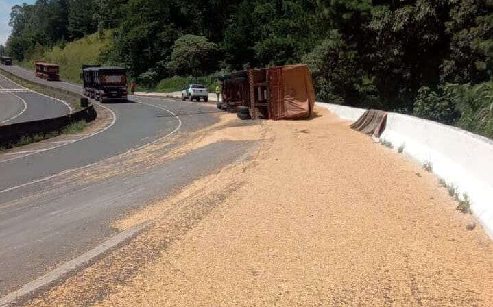 Uma carreta Volvo 440, com placas de Maringá, tombou na BR-376, no km 304, no final da manhã desta terça-feira (7), na saída de Mauá da Serra para Ortigueira, no Vale do Ivaí. O veículo estava carregado de grãos, que se espalharam pela pista.