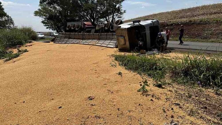 O acidente aconteceu a cerca de 200 metros do portal de entrada da cidade para quem chega de Lunardelli. O caminhoneiro seguia sentido a Lunardelli, quando saiu da pista e tombou.