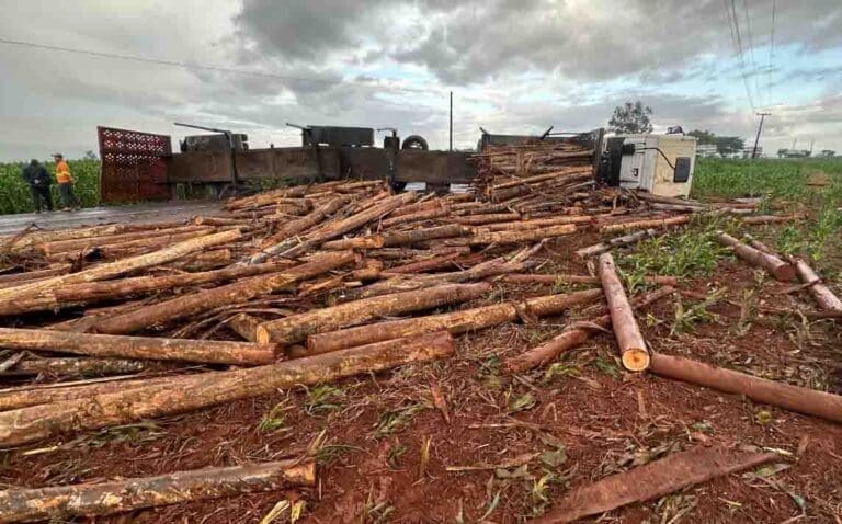 Uma carreta carregada com tora de pinus tombou na manhã desta quarta-feira (3) na PR-082, em São João do Ivaí.