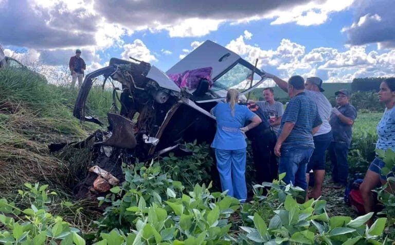 Para evitar a colisão frontal, o motorista precisou recuar e acabou atingindo a traseira de um ônibus que seguia na mesma direção que ele. Após a batida, o veículo invadiu uma plantação de soja e capotou.