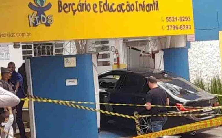 O acidente foi registrado na Rua Moliere, por volta das 12h30, quando um carro de luxo BMW bateu contra o portão do Berçário e Educação Infantil Projeto Kids.