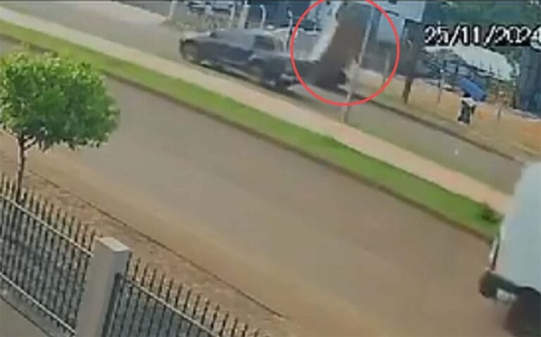 As imagens, registradas por uma câmera de segurança, mostram uma carreta carregada com toras de madeira passando pela via. Atrás dela, um caminhonete preta para na pista ao perceber que algo estava errado. Na sequência, um Fiat Uno estacionado é levantado pela traseira e capota de forma inesperada.