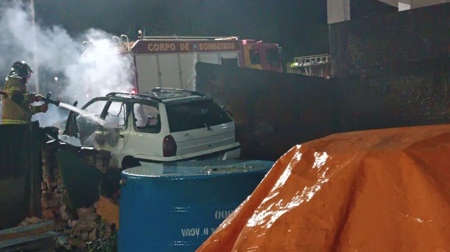 O impacto quebrou parte do muro, e o veículo ficou pendurado. Pouco depois, as chamas se espalharam rapidamente e tomaram conta do automóvel.