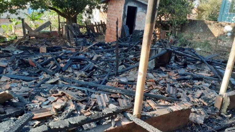 Uma casa de madeira foi completamente destruída por fogo, na madrugada desta quarta-feira (2), na Rua Dom Pedro II, em Jardim Alegre.