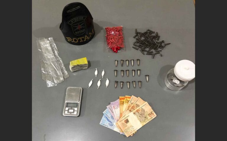 Na residência do casal, os policiais encontraram 13,5 gramas de cocaína, divididas em 4 buchas e 16 eppendorfs, além de um celular, um caderno com anotações do tráfico, embalagens para armazenar a droga, uma balança de precisão, um tablete de 78 gramas de maconha e R$ 204,00 em dinheiro.