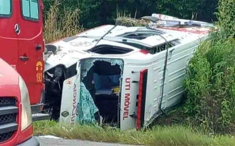 De acordo com a Polícia Rodoviária Federal (PRF), a batida envolveu um Gol, um Uno, um Ecosport e uma ambulância. O acidente foi uma colisão lateral, seguida de colisão frontal e tombamento.