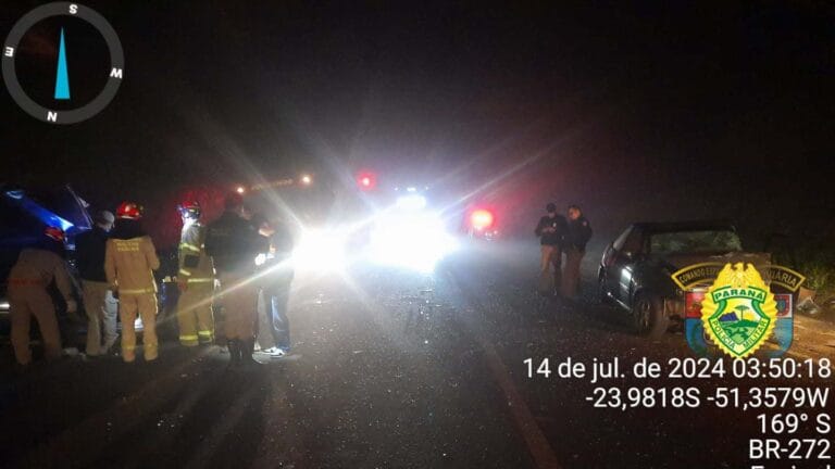 Um grave acidente na PR-272, no km 221+500, próximo ao município de Faxinal, no Paraná, deixou um morto e cinco feridos na madrugada deste domingo (14).