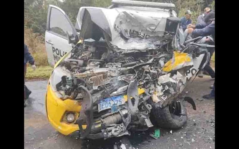 Nesta segunda-feira (5), um grave acidente foi registrado na PR-487 na região de Cândido de Abreu. A batida envolveu um um carro forte, uma viatura da Polícia Rodoviária Estadual (PRE) e uma camionete L-200 Triton com placas de Cândido de Abreu.