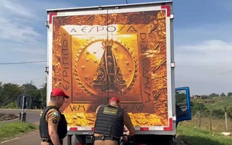 No final da manhã desta segunda-feira (8), a Polícia Rodoviária Estadual (PRE) realizou a abordagem de um caminhão na PR-444, em Apucarana, Norte do Paraná, e apreendeu cerca de 20 mil pacotes de cigarros. O que chama a atenção na ocorrência, porém, é que o contrabando estava em um caminhão com imagem de Nossa Senhora.
