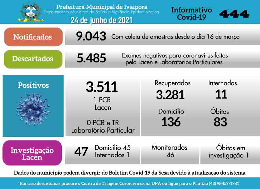 Com esse novo caso, Ivaiporã soma 3.511 pacientes infectados com a doença desde o início da pandemia, 3281 se recuperaram. No momento, 147 pessoas estão com o vírus ativo, dessas 11 hospitalizadas.