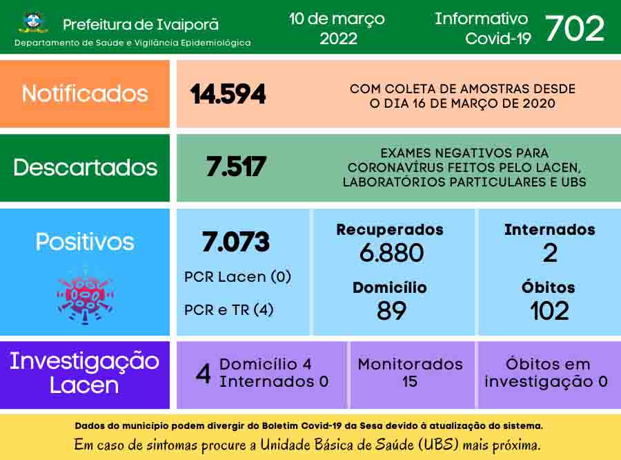 Nesta quinta-feira (10), foram confirmados quatro novos de casos de Covid-19. Após dois meses com elevado número de contaminação, Ivaiporã tem 89 pacientes em recuperação (dois internados) e 68 recuperados.