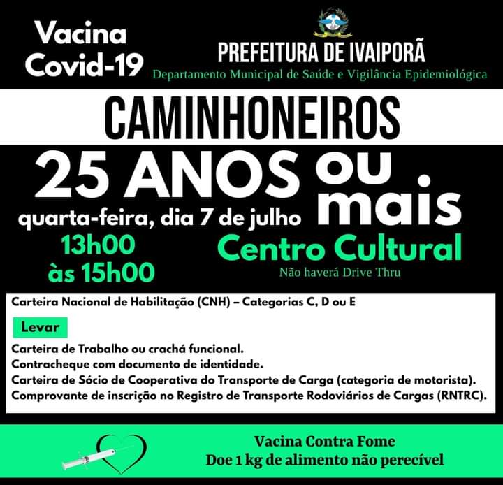 Nesta quarta-feira (7) em Ivaiporã, público em geral com 43 anos ou mais e caminhoneiros com mais de 25 serão imunizados com a vacina contra a Covid-19.