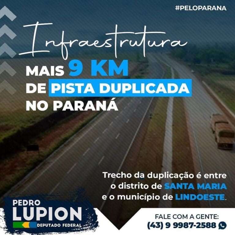 O Departamento Nacional de Infraestrutura de Transportes (DNIT) libera mais 9 quilômetros de duplicação na BR-163/PR, entre o distrito de Santa Maria e o município de Lindoeste-PR.As obras na rodovia vão garantir maior trafegabilidade e segurança à população da região e é uma ação do nosso ministro Tarcísio Gomes de Freitas , do governo Jair Messias Bolsonaro .