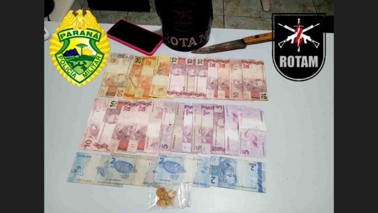 Crack e dinheiro apreendido com os suspeitos / Foto: PMPR