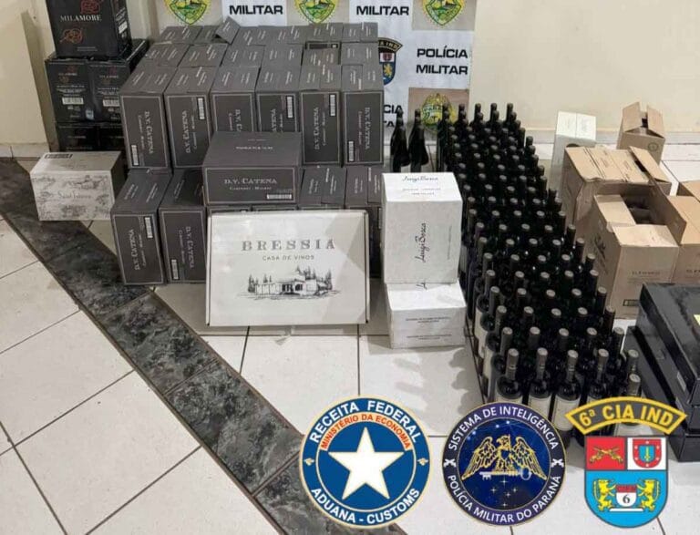 No primeiro caso, por volta das 3h50, foi abordado o Nissan Kicks que era ocupado por duas pessoas. os militares encontraram no veículo 473 frascos de vinhos de diversas marcas avaliados em R$ 65 mil.
