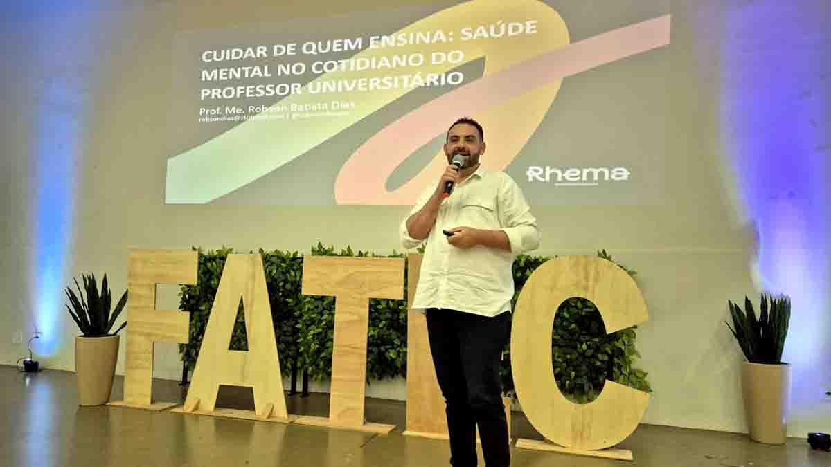 Na sequência, o encontro geral com os professores trouxe temas ligados à saúde mental e ao desenvolvimento humano. A palestra foi conduzida pelo psicólogo e professor do Rhema Neuroeducação, Robson Dias, que abordou a importância do autocuidado no ambiente universitário. “Quem educa também precisa estar bem. Professores e equipes lidam diariamente com demandas emocionais intensas. Por isso, cuidar da própria saúde emocional é condição essencial para acolher o outro”, alertou.