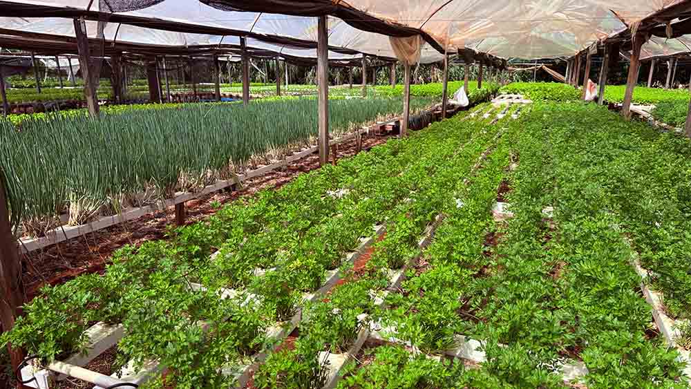 Na hidroponia, a planta não entra em contato com o solo e recebe os sais minerais que precisa em proporção equilibrada dissolvidos em água corrente. Nas três estufas da propriedade são cultivadas em bancas, cinco espécies como, cebolinha, salsinha, agrião, rúcula, chicória e almeirão.