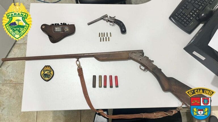 Durante a operação, os policiais militares encontraram uma espingarda calibre .32 com cinco munições e uma garrucha Rossi calibre .22 com nove munições, todas dentro da residência.