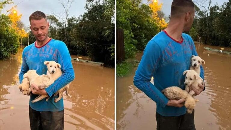 “Bicho é tudo. Que nem um filho”. Foi esse o argumento utilizado por um morador de São Sebastião do Caí, município da Região Metropolitana de Porto Alegre, Rio Grande do Sul, para salvar três filhotes de cachorro de uma área alagada na tarde dessa segunda-feira (4).
