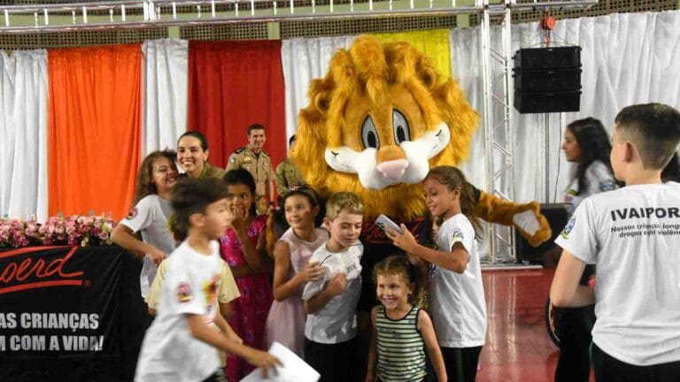 Como parte da solenidade não poderia faltar o Leão Daren – mascote do Proerd, que sempre faz um grande sucesso com a garotada. A solenidade também incluiu entrega de premiação aos alunos destaques de cada turma, que melhor escreveram redações durante as aulas do Proerd.