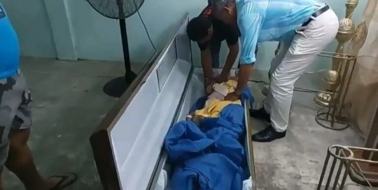 Vídeos que circulam no Twitter mostram Bella Montoya, de 76 anos, dentro do próprio caixão aberto e respirando com dificuldade após o confinamento prolongado, enquanto dois homens a auxiliam e a colocam em uma maca.