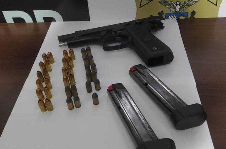 Na residência, os policiais encontraram uma pistola calibre .380 e 35 munições, todas armazenadas de forma irregular. A arma estava fora das condições regulamentares.